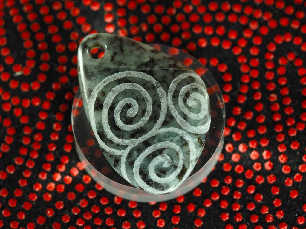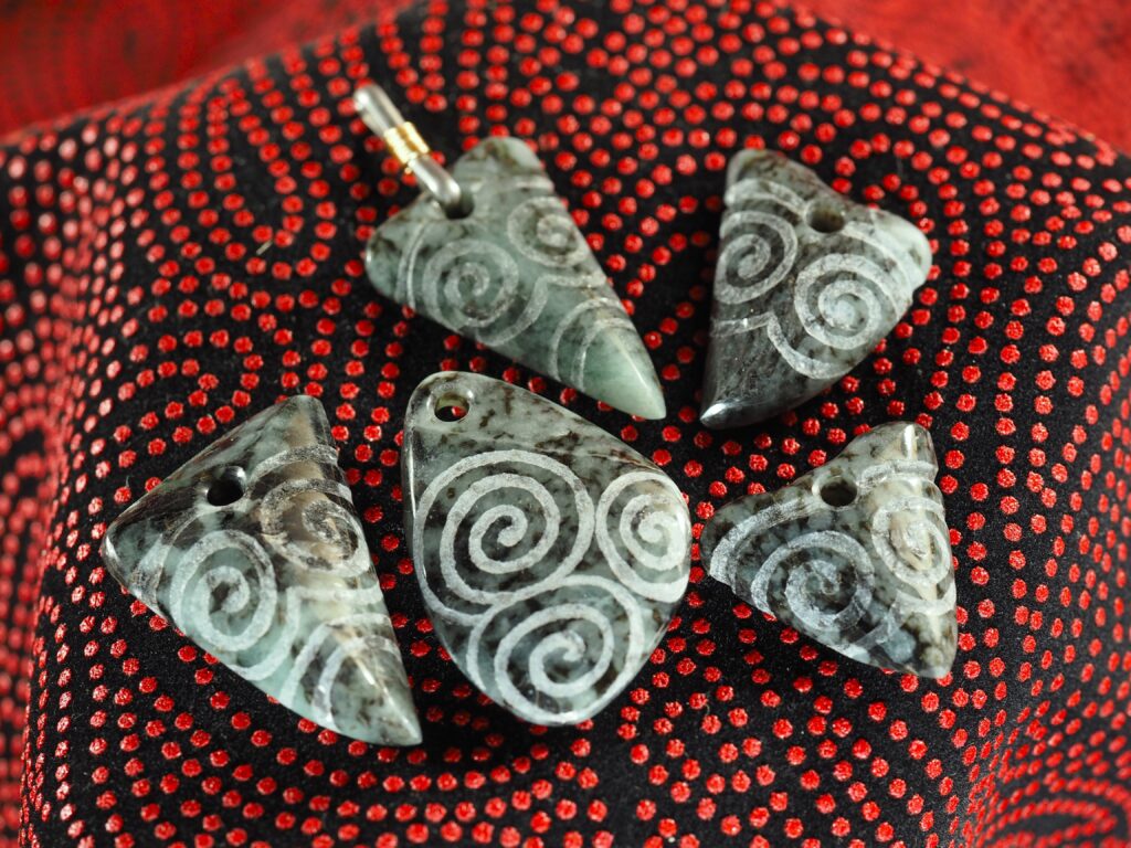 三角っぽいのはサメの牙玉をイメージした縄文風の線刻をして、縄文以来の「ヒトと翡翠の物語」を作品にする。
