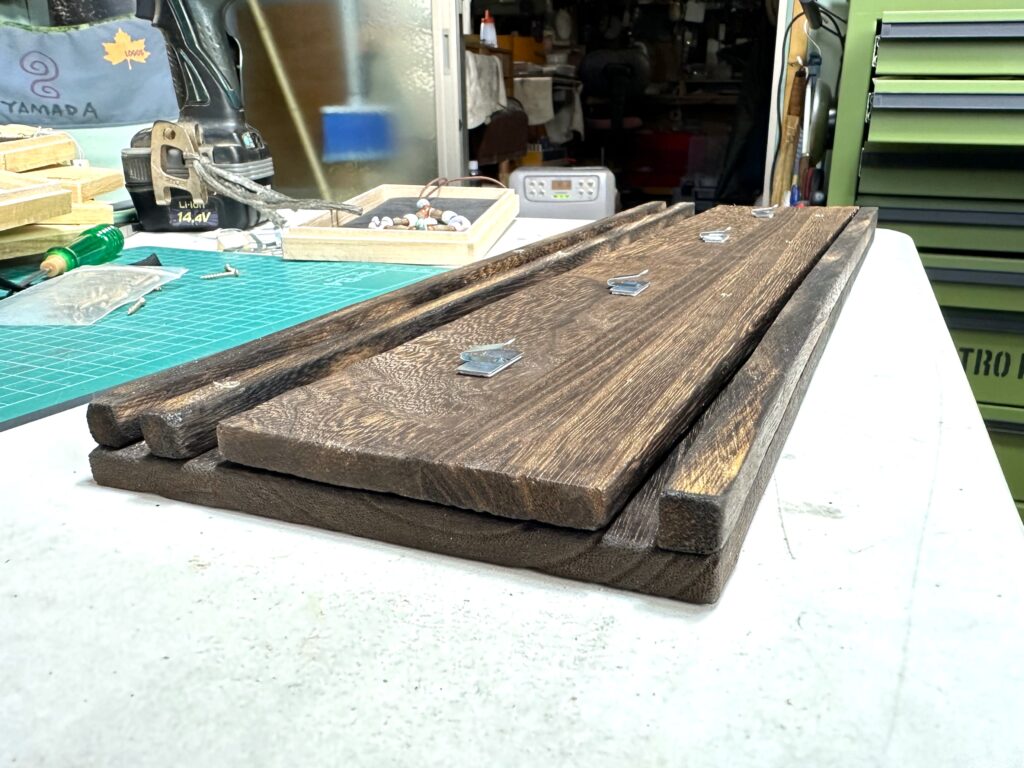 バーナーで黒く焼いた1㎝角の棒の間に縦板を差し込むだけ。
