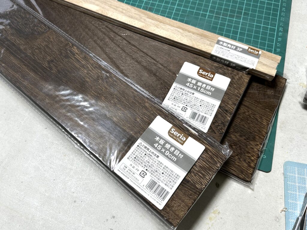 工具なしで簡単に組立・解体ができ、収納時に嵩張らない条件で百均に材料探しにいったら、お誂え向きの焼いた桐板があった。