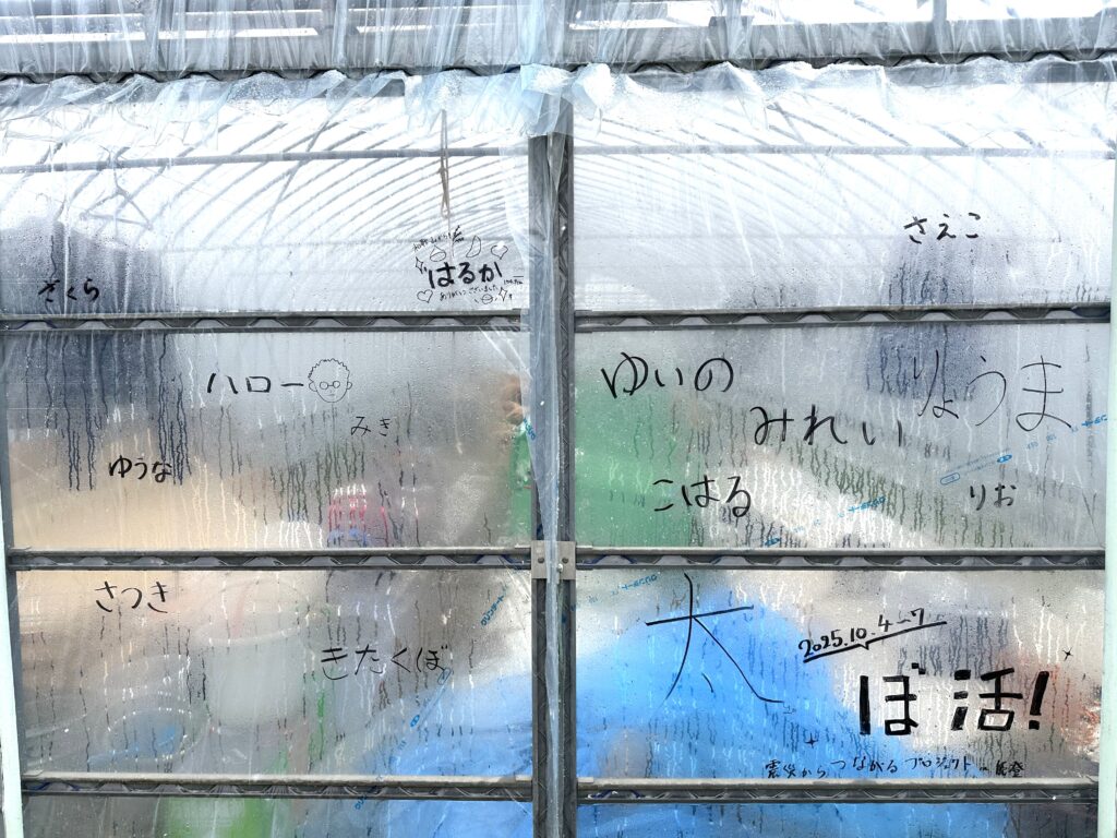 学生ボランティアらしき団体も来ているようで、ビニールハウスの扉にマジックで寄せ書き。