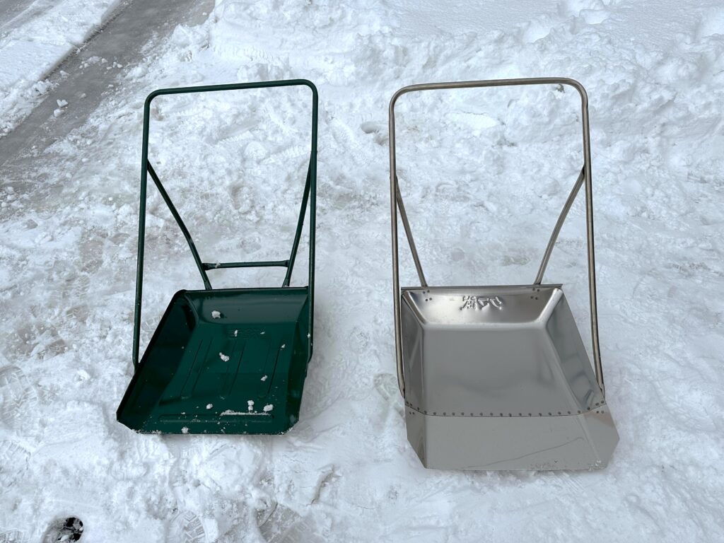 わたしの愛用品のスノーダンプで、左がサイズによって9,000円前後の鉄製の「吉鉄」小サイズで、右が1万円を超えるステンレス製の「クマ武」大サイズ。一番の違いは素材だけでなく、ハンドル下部の横梁の有無で、これがあると堅く締めがたまった雪に足で押し込んだり、膝より高い位置の雪に手でもって差し込みやすいのだ。