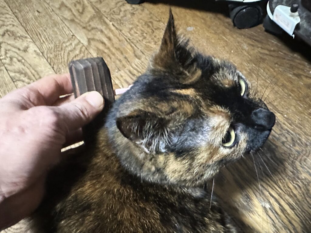 古ハブラシでネコを撫でたら、毛すきブラシより気持ちよげでウットリするので、「三連式ネコナデール・雅」を開発!