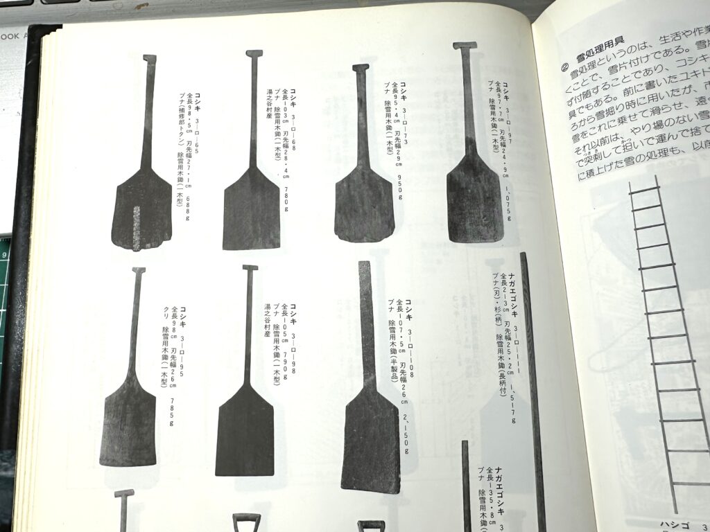 こちらが木でつくった鋤だからコスキで、同じ新潟県内でも十日町ではコシキと訛るようだ。雪山を歩く時の杖や橇にも使われ、山間部には軽くて使いやすいからと、いまだ愛用している小滝区のお年寄りに会ったことがある器多様なスコップ。