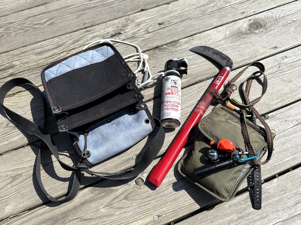 今年からガイドは腰袋にいれた柄の長い厚目鎌とクマ除けスプレイを携行することにした。右端の緑色のポーチは、スマホと貴重品、車のキーを収納して普段から持ち歩いているのだけど、災害に備えてサバイバルホイッスルと強力な小型とコンパスも追加。