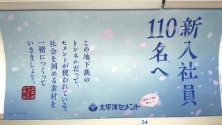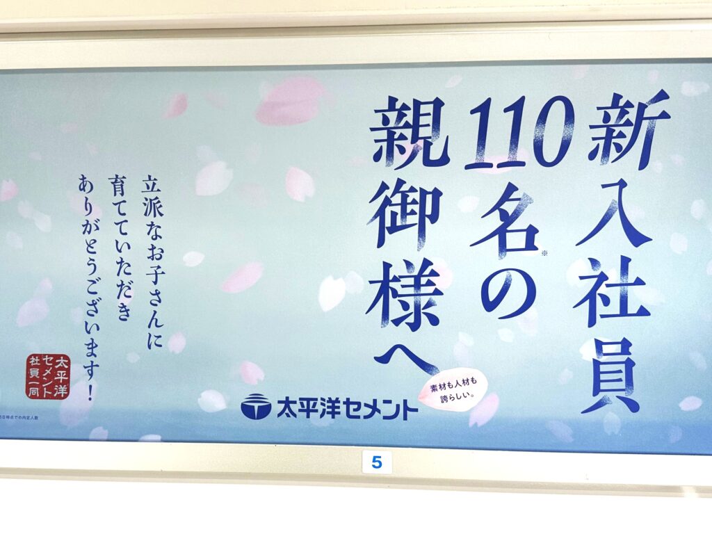 年度末に山手線に乗ったら、セメント会社が新入社員に向けた広告がズラリとならんでいた。