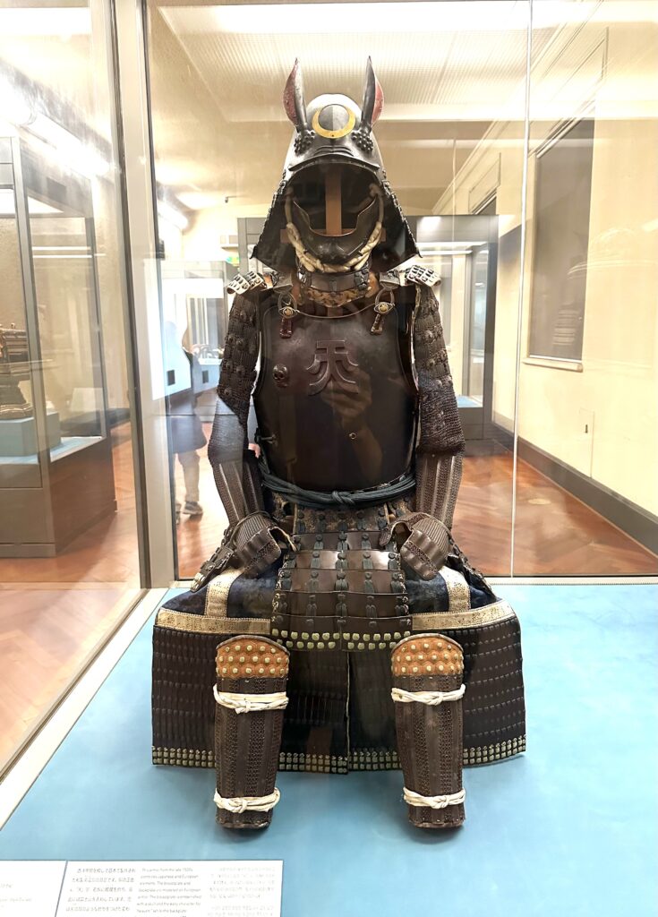 左馬之助の甲冑の全体像。鎧は西洋の様式をうけた鉄砲につよい「鉄二枚胴」で、安土桃山時代に登場した当世具足(とうせいぐそく)の最高傑作の一領とされる。