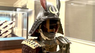 イノシシやクマの毛を植毛した不気味な兜もある一方で、ケムシ、ムカデ、カニ、大根!の前立があったり、兜の形自体が富士山や絶壁をかたどっていたりと、日本の甲冑は自然界の象徴で飾られているのも面白い。